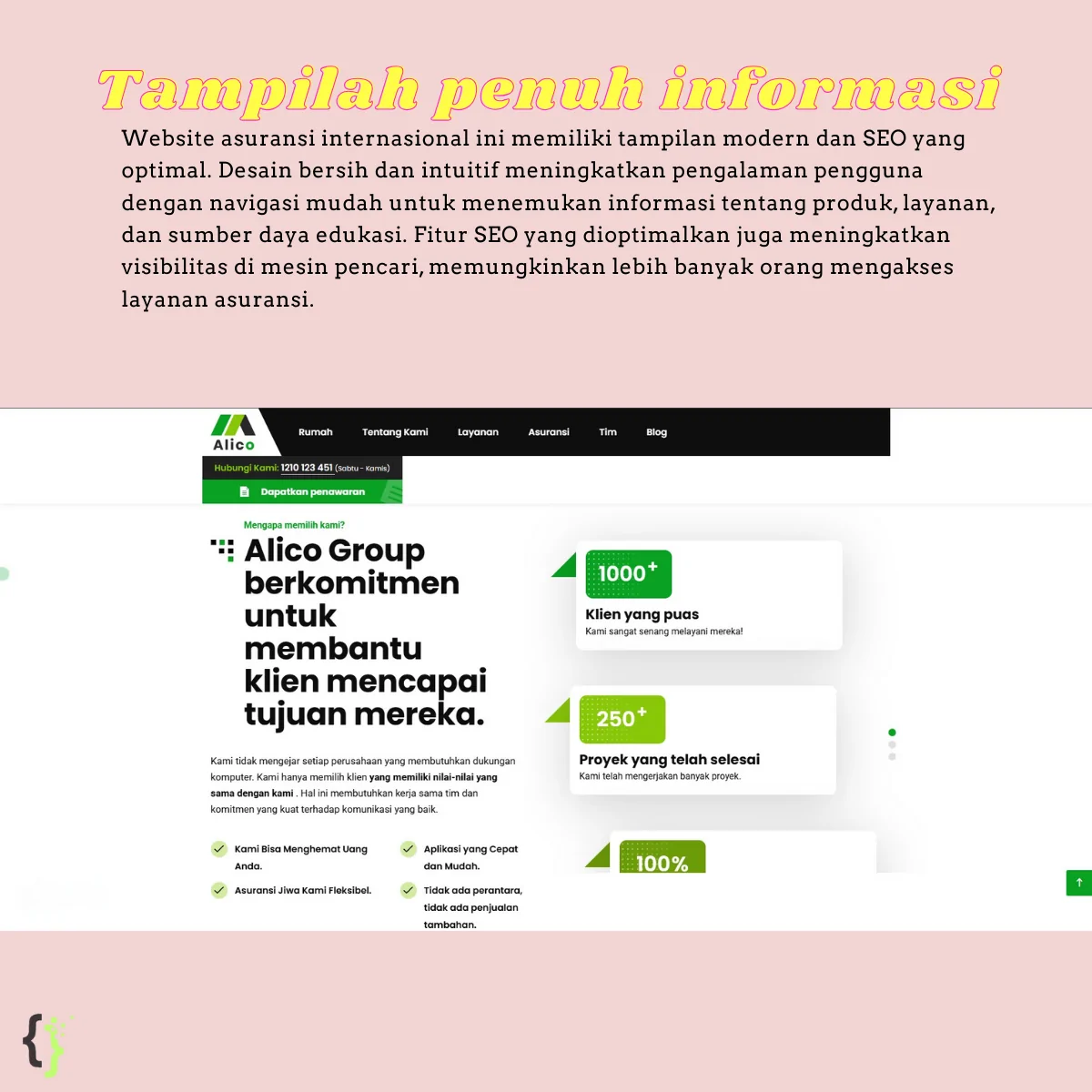 Hadirkan platform digital profesional untuk bisnis asuransi Anda (Kendaraan, Properti, Jiwa, dll). Kami menyediakan layanan pembuatan website siap pakai dengan standar visual tinggi dan optimasi mesin pencari (SEO) terbaik untuk memastikan bisnis Anda tampil di halaman utama Google.