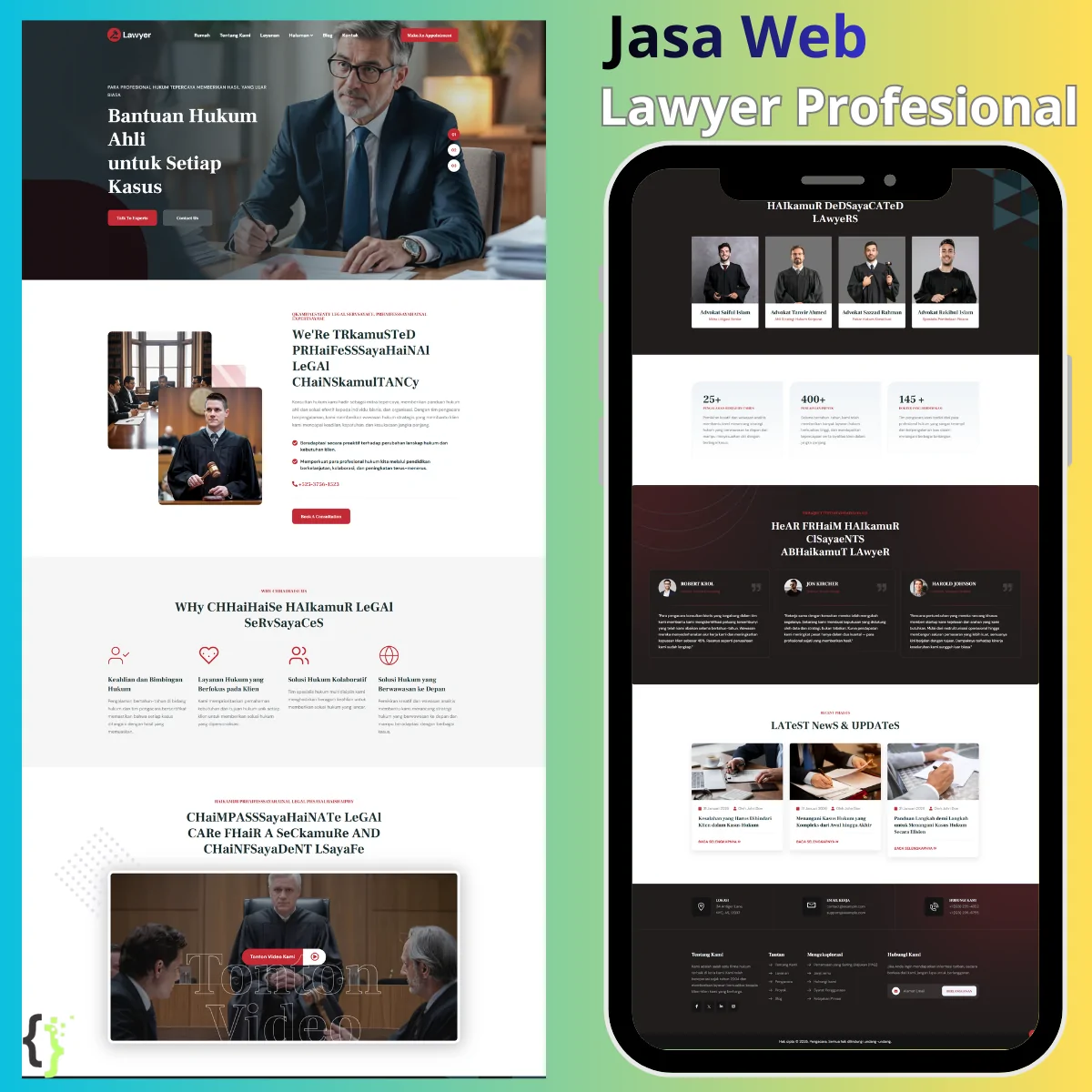 Tingkatkan kredibilitas kantor hukum Anda dengan website yang elegan, responsif, dan memiliki keamanan tingkat tinggi. Kami melayani pembuatan website untuk Advokat, Pengacara, dan Konsultan Hukum dari Sabang sampai Merauke secara remote dan profesional.