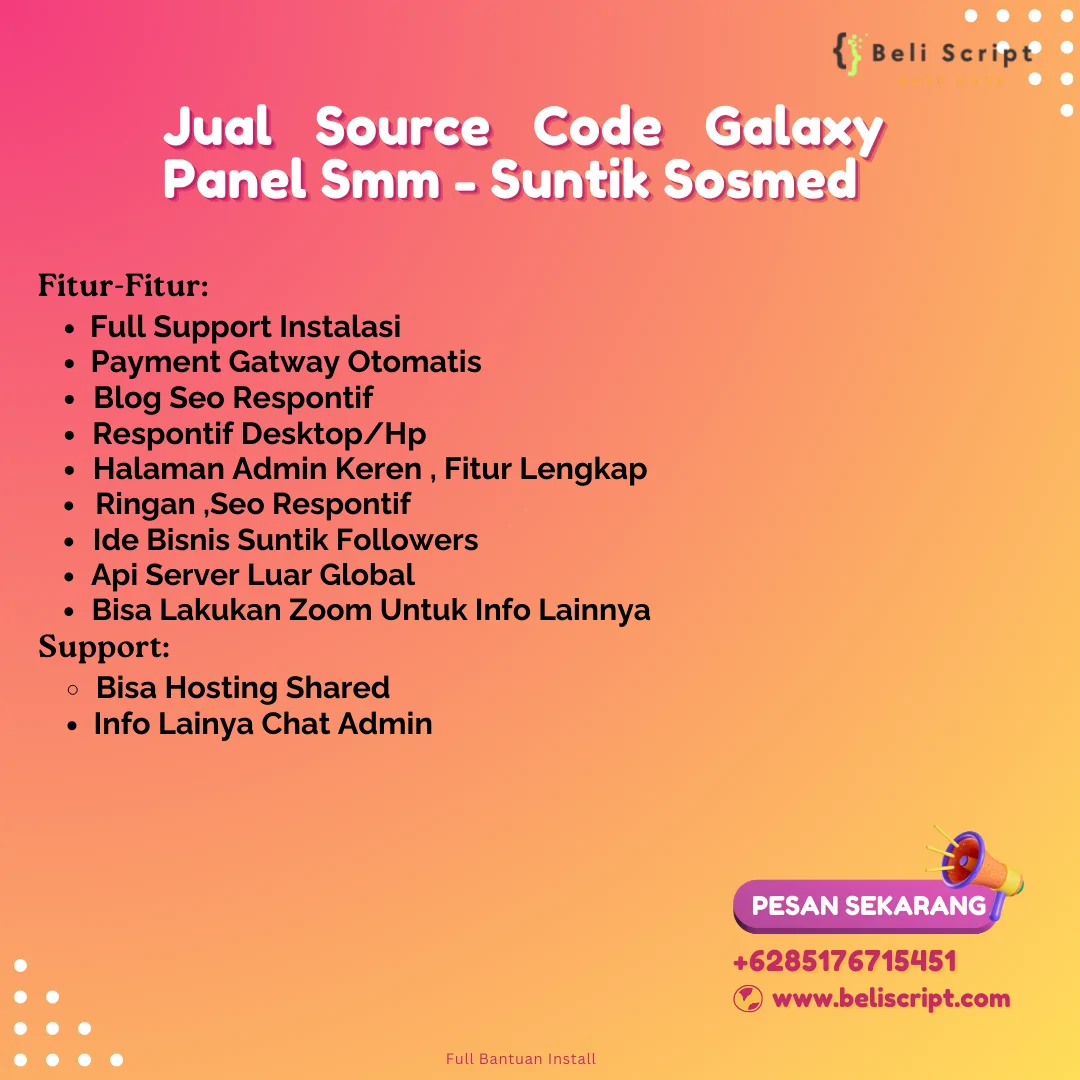 Wujudkan bisnis Social Media Marketing (SMM) yang menguntungkan dan serba otomatis dengan Script Web Galaxy SMM Panel Full Source Code ini! Ini adalah solusi premium yang terintegrasi dengan API Boost SMM Panel & sistem pembayaran otomatis, dirancang untuk Anda yang ingin membangun platform layanan media sosial sendiri, mengelola kehadiran digital dengan efisien, dan menghasilkan profit yang luar biasa sebagai penyedia jasa SMM.