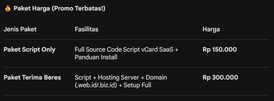Hashtag: #vCardSaaS #JasaPembuatanWebsite #ScriptWebsite #KartuNamaDigital #KartuBisnisDigital #DigitalBusinessCard #JasaWebsiteMurah #BisnisDigital #vCardIndonesia #SourceCodeWebsite